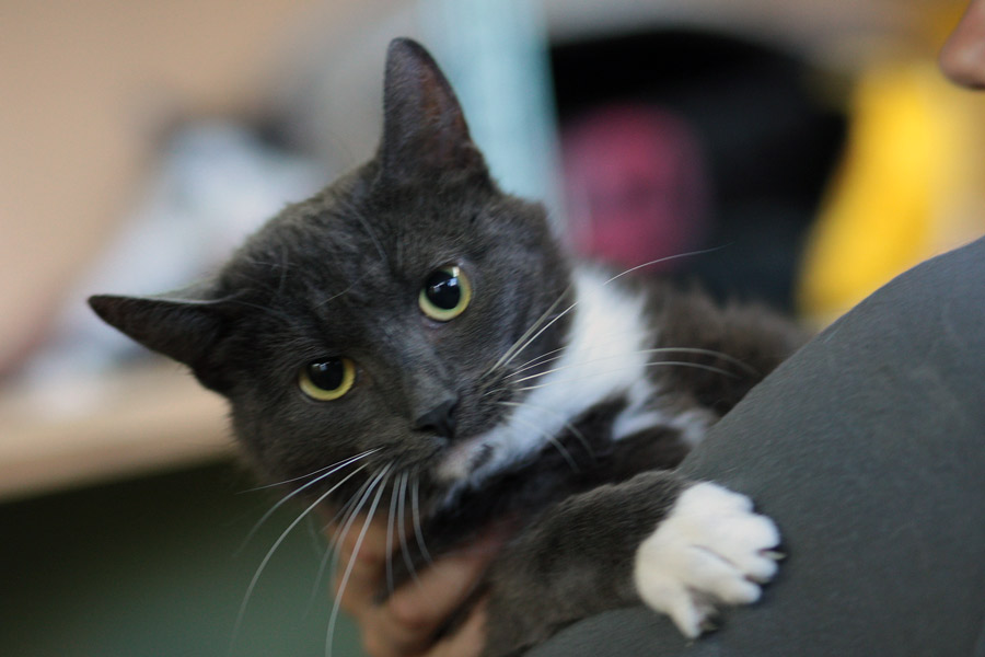 Миф о том, что Маркиза не любит общение, - это всего лишь миф. Она очень ласковая кошка, любит гладиться. Но она просидела на Гурского очень долго и все время пряталась в лотке, поэтому она все еще в стрессе. Когда у нее убирают в клетке, она забивается в угол и стоит там на задних лапках. Но стоит до нее добраться и начать гладить - кошка мурлыкает и подставляет то одну, то другую щечку для почесонов