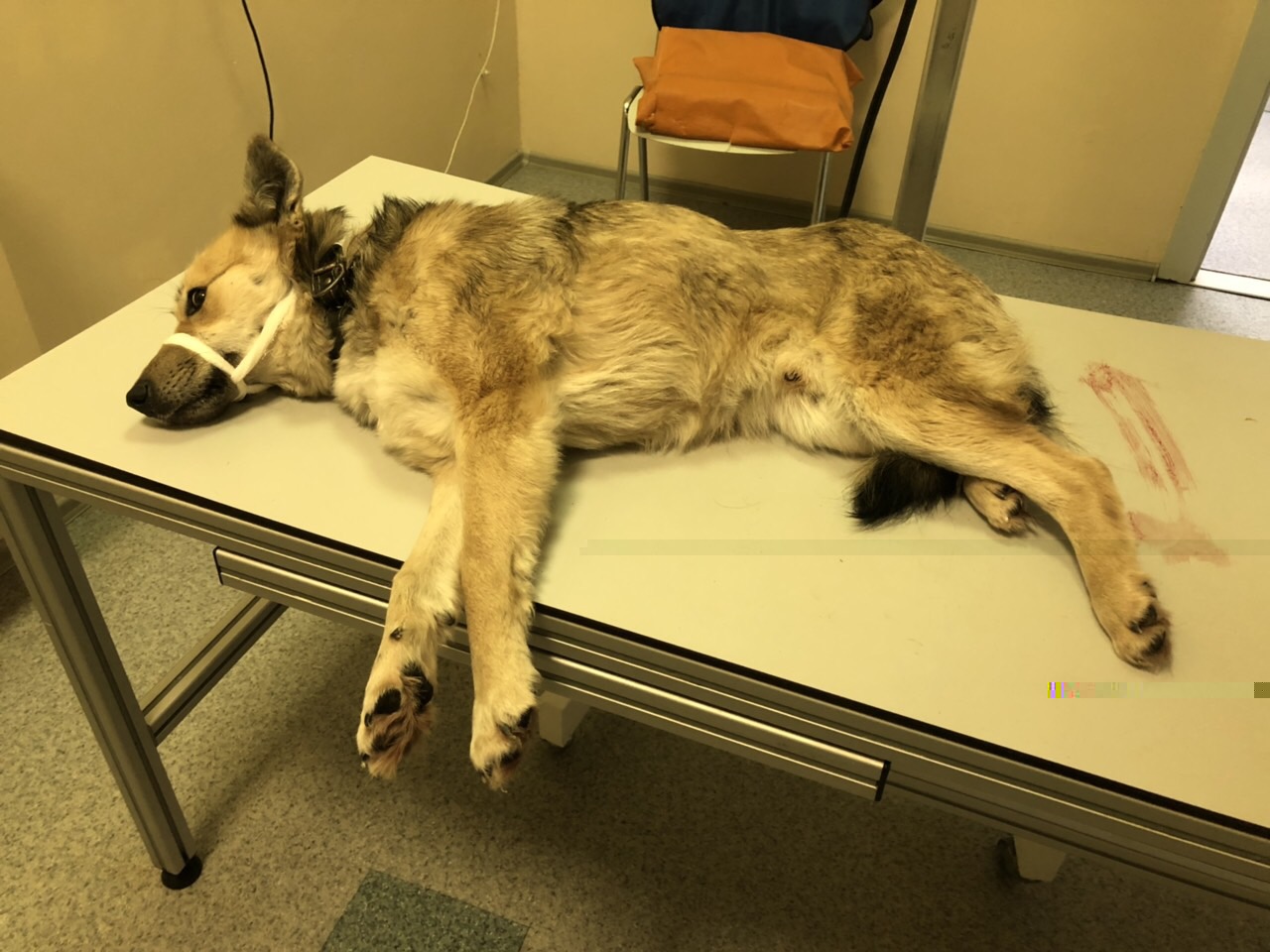 В целом пёс спокойный, в клинике на собак не реагировал, только немного наблюдал, в основном спал. Не кусается. Выглядит запуганным и забитым, прижимает голову к полу. При осмотре врача переживал.