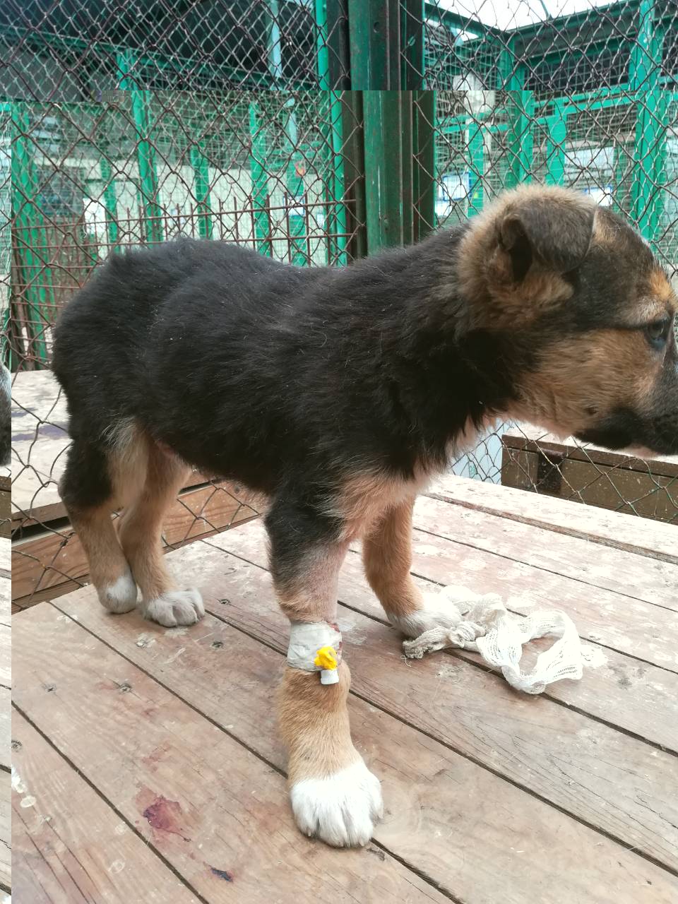 Этот щенок на лечении от пиропазмоза (укусил клещ, поэтому с катетером), но сегодня обнаружилось, что он каким-то образом сломал лапку .... не наступает на нее...