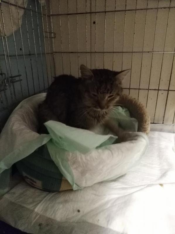 Вчера этот котик приехал в приют. Состояние тяжелое. Температура низкая. Очень слабый. Хвост весь - застарелая инфицированная рана. Понос. Ходит под себя, ножки дрожат от слабости. Капаемся растворами, антибиотиком и т.д. Надеюсь, добрый знак то, что котик пытается кушать, вчера немножко лакал куриный бульон. Зовут ФИЛЯ