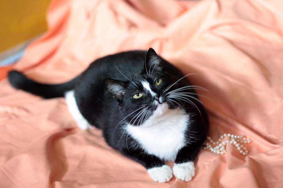 Окрас: чёрная с белой крудкой и элегантной белой капелькой на мордочке