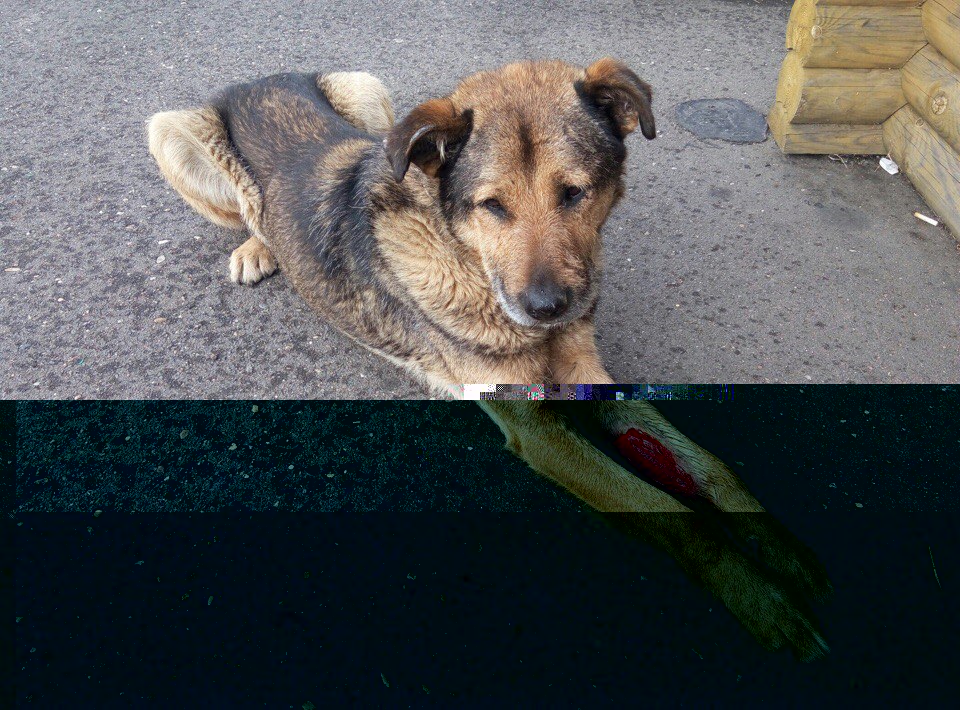 На трассе собака с раной большой на лапе. Ходит, но рана огромная.