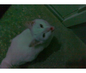 Найдена кошечка, проживает в подъезде по адресу ул. Высокая 11В ... Белая, пушистая и миниатюрная, желтые глазки, легко идет на контакт с людьми, ласковая. На ней желтоватый ошейник с черной окантовкой, немного грязный хвостик, но в целом она чистенькая!